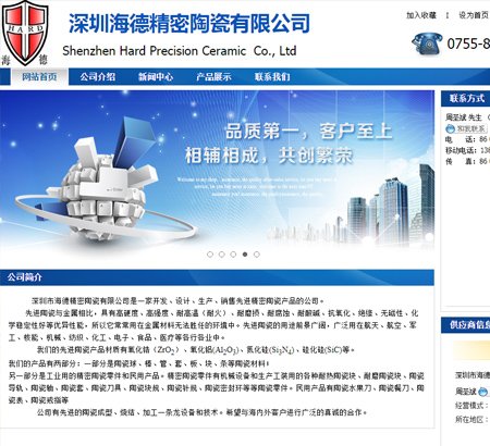 網(wǎng)站建設(shè)公司,做網(wǎng)站優(yōu)化關(guān)鍵詞排名SEO,營銷型,手機網(wǎng)站建設(shè),響應(yīng)式,品牌型,電商/門戶,外貿(mào)型網(wǎng)站建設(shè). 深圳市海德精密陶瓷有限公司是一家開發(fā)、設(shè)計、生產(chǎn)、銷售先進精密陶瓷產(chǎn)品的公司。地址:深圳市西麗鎮(zhèn)