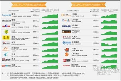 最近,艾瑞咨詢發布了2011年中國排在前20名的(Top20)互聯網最有影響力品牌榜:騰訊、微軟、百度、360已經成為中國最具影響力的四家互聯網企業品牌。